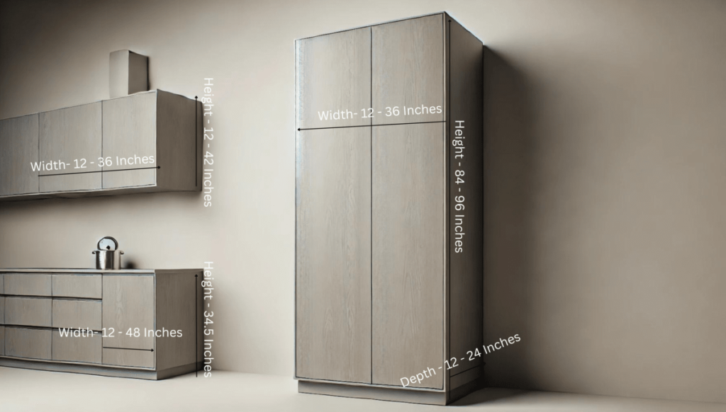A kitchen with no wasted space and awkward gaps is a dream. But how can we achieve this? By sticking to standard cabinet sizes and dimensions. This will help you optimize every inch of your space, ensuring optimal functionality and storage for your appliances while offering cohesive aesthetics that enhance style and convenience. The main parts of a kitchen cabinet include: This blog debunks the kitchen cabinet dimensions and sizes, ensuring your kitchen remains visually attractive and practical. Base Kitchen Cabinet Standard Dimensions Following the standard dimensions of kitchen base cabinets helps you design a functional and beautiful kitchen. These cabinets form the foundation of your kitchen layout, supporting countertops and electrical appliances. Below are the standard cabinet dimensions, including height, depth, and width. Kitchen Base Cabinet Standard Dimensions Height, without countertop 34.5 inches Height, with countertop 35 to 36 inches Depth (front to wall), without countertop 24 inches Depth, with countertop 25 to 26 inches Standard widths 12, 18, 24, 30, 33, 36, 48 inches Kitchen Base Cabinet Standard Height It’s important to consider the height of base cabinets to ensure they are comfortable and practical. The standard height for a base kitchen cabinet is 34.5 inches, and when you add a countertop, it totals around 35 to 36 inches. These measurements create a comfortable working space for most people, making food preparation and other tasks easy and ergonomic. You can also customize the dimensions, with 38 inches the maximum and 32 inches the minimum. These adjustments can cater to taller individuals and those in wheelchairs, respectively. Kitchen Base Cabinet Standard Depth It is essential to have sufficient kitchen cabinet depth to maximize storage space while maintaining accessibility. Usually, the standard depth of a base cabinet, not including the countertop, is 24 inches back to back. The countertop’s finished depth increases to approximately 25-26 inches to allow for a slight overhang. This overhang serves the dual purpose of creating extra workspace and protecting the cabinet fronts from spills and wear. You can also create a cabinet blind corner by placing two cabinets at 90 degrees. This will increase the diagonal depth to the back corner. Adequate depth helps accommodate a wide range of kitchen items in the cabinets, from pots and pans to pantry items. Kitchen Base Cabinet Standard Width You can alter the width according to your requirements, making it suitable for different kitchen layouts and storage needs. The standard base cabinet widths are available in various sizes, typically starting at 12 inches and going up to 48 inches. Common width options are 12, 18, 24, 30, 36, and 48 inches. These choices offer the flexibility for customization while maintaining a unified appearance. Wider cabinets are great for storing larger items, while narrower options can fit into small spaces, making the most of every inch of kitchen space. Kitchen Wall Cabinet Standard Dimensions Choosing the right dimensions for kitchen wall cabinets will optimize your kitchen space and enhance overall functionality. Wall cabinets provide crucial storage without using floor area, so adequate sizing is necessary. Here is a breakdown of kitchen wall cabinet dimensions: Kitchen Wall Cabinet Standard Dimensions Standard Height 12, 15, 18, 24, 30, 36, 42 inches Standard Depth 12, 15, 18, 24 inches Standard Width 12 to 36 inches Kitchen Wall Cabinet Height Wall cabinets come in different heights, such as 12, 15, 18, 24, 30, 36, and 42 inches. These choices enable you to customize your kitchen to suit ceiling heights and storage requirements. You can keep the space between the top of the cabinets and the ceiling open or closed with soffits. Taller cabinets provide additional storage up to the ceiling for items used less frequently. Kitchen Wall Cabinet Standard Depth The standard kitchen cabinet depth is 12 inches, which is ideal for storing dishes and glassware. Some designs have 15, 18, or 24 inches depths to accommodate larger items. Wall cabinets installed above refrigerators should match or closely match the refrigerator’s depth because of the refrigerator’s size. Although deeper cabinets provide more storage, their placement needs to be carefully considered to preserve counter space and maintain an open feel in the kitchen. Kitchen Wall Cabinet Standard Width The available widths typically range from 12 to 36 inches, offering flexibility for different wall dimensions and organizational requirements. Additionally, you can adjust the depth to be as narrow as 9 inches or as wide as 48 inches. Compact cabinets are ideal for small spaces or specialized storage needs, while wider cabinets can accommodate larger items and serve as focal points in design. Kitchen Tall Cabinet Dimensions Tall cabinets can offer plenty of storage space and improve the area’s overall functionality in any kitchen. However, to maximize their role in your kitchen layout, it’s essential to have a good grasp of their measurements. Here is an overview of the standard kitchen tall cabinet dimensions: Kitchen Tall Cabinet Standard Dimensions Standard Height 84 or 96 inches Standard Depth 12 or 24 inches Standard Width 12, 24 or 36 inches Kitchen Tall Cabinet Height Tall cabinets are usually available 84 or 96 inches in height, providing ample vertical storage space that can extend near or all the way up to the ceiling. This is ideal for keeping the kitchen tidy and clutter-free by storing infrequently used items like bulk pantry supplies or seasonal kitchenware. Kitchen Tall Cabinet Depth The typical height of tall cabinets is 12 or 24 inches. A 12-inch depth is perfect for storing canned goods or small appliances, allowing easy access without occupying excessive space. A 24-inch depth provides additional space for bigger items like brooms or vacuum cleaners, making it well-suited for versatile storage options, su